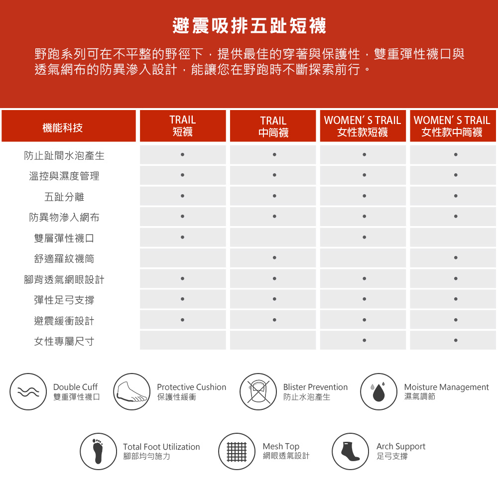 - 五趾分離設計,減少趾縫間的皮膚摩擦,避免水泡產生。
