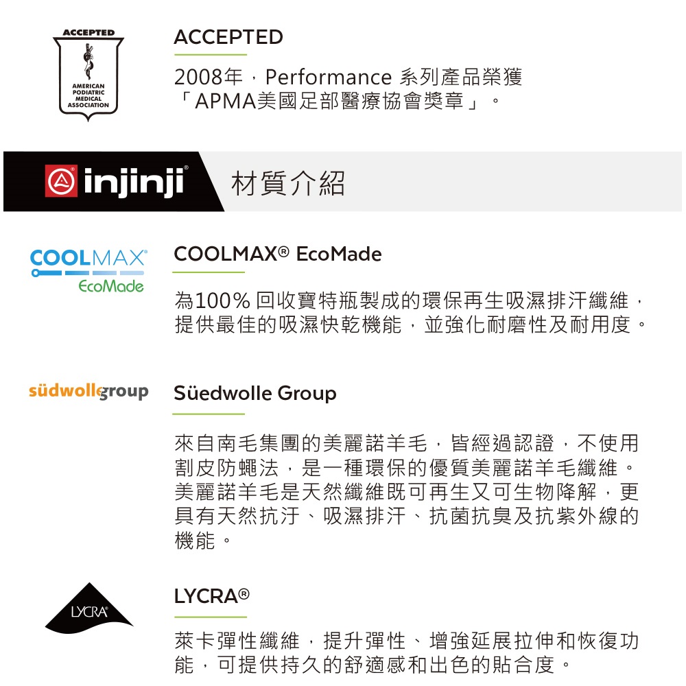 - 採用COOLMAX EcoMade環保再生纖維,提供最佳的吸濕排汗機能,並強化耐磨性及耐用度。