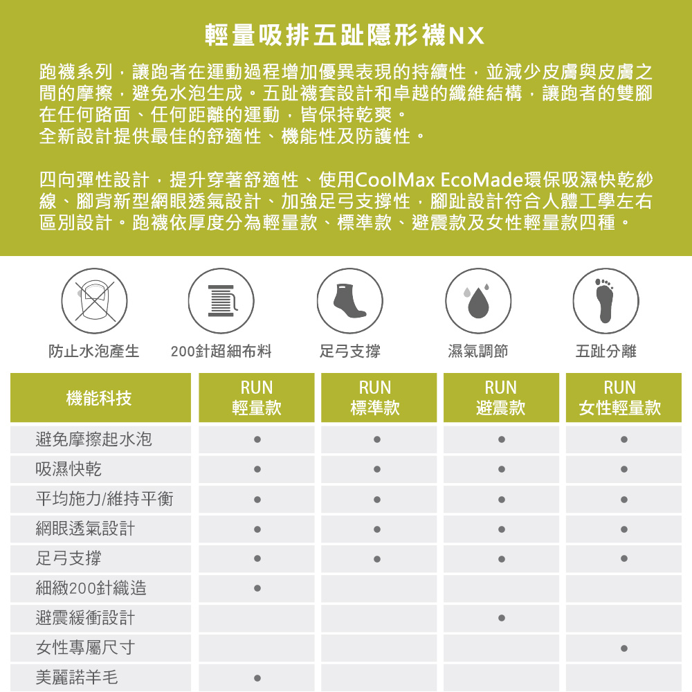 - 五趾分離設計,減少趾縫間的皮膚摩擦,避免水泡產生。