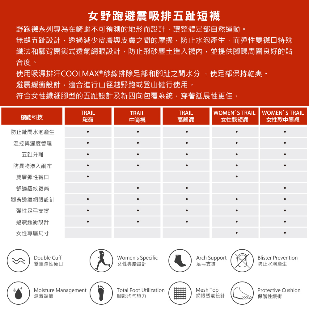 - 五趾分離設計,減少趾縫間的皮膚摩擦,避免水泡產生。