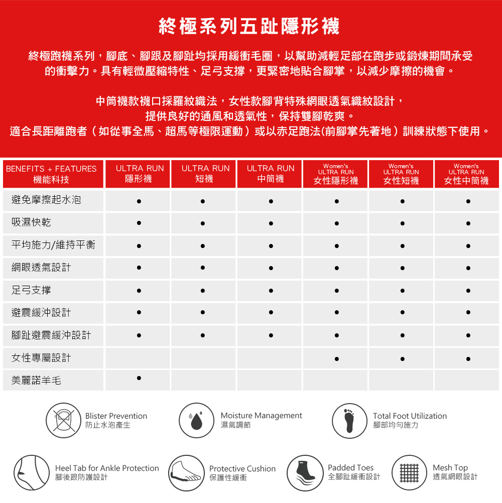 - 五趾分離設計,減少趾縫間皮膚摩擦,避免水泡產生。