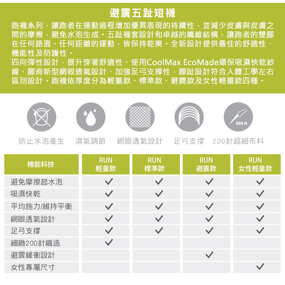 - 五趾分離設計,減少趾縫間的皮膚摩擦,避免水泡產生。