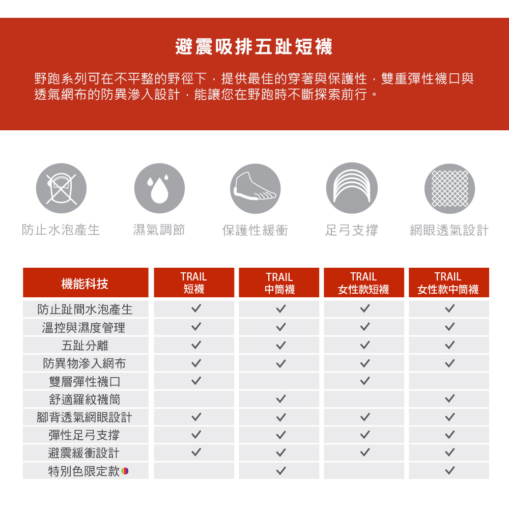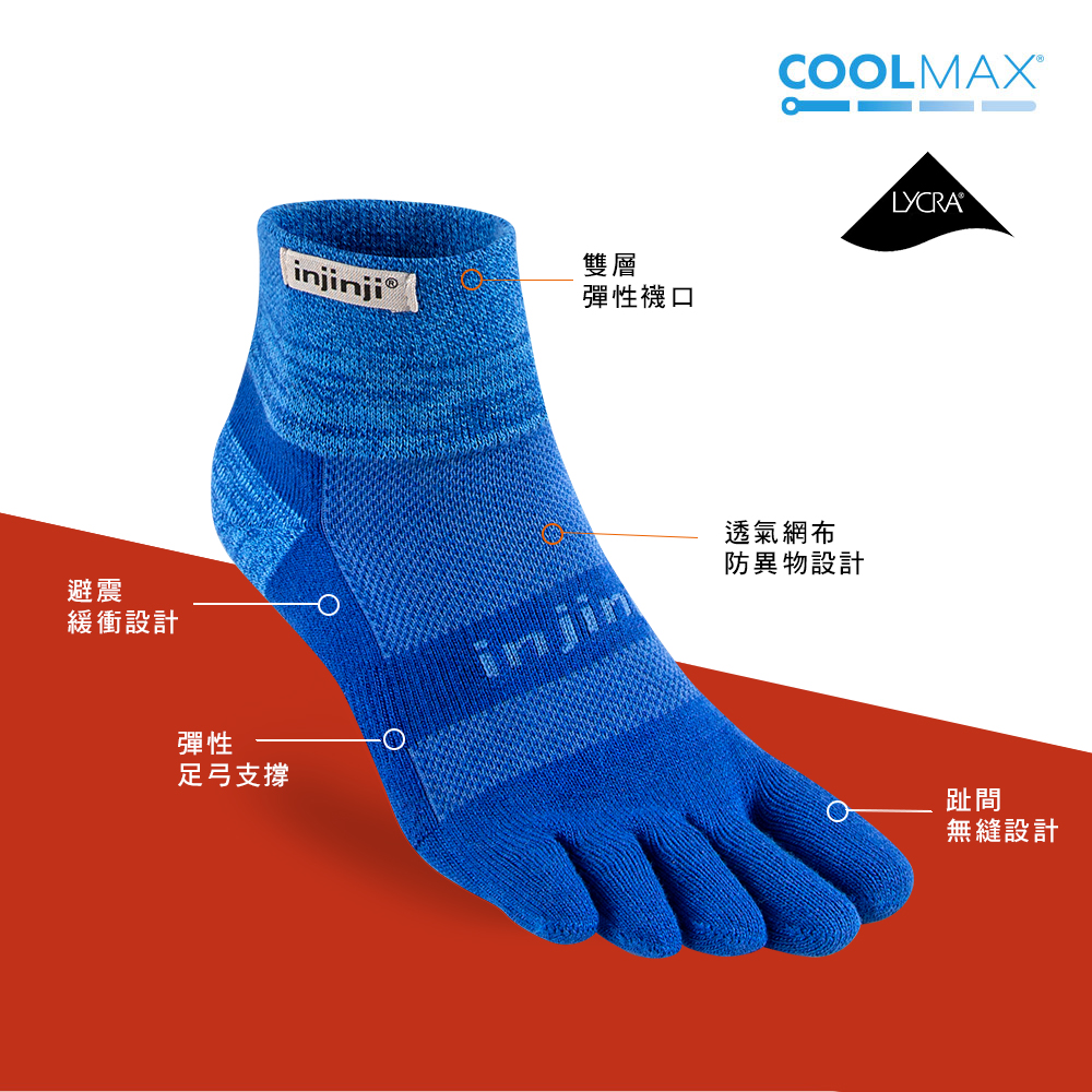- 採用COOLMAX纖維,提供最佳的吸濕排汗快乾機能。五趾分離設計,減少趾縫間的皮膚摩擦,避免水泡產生。