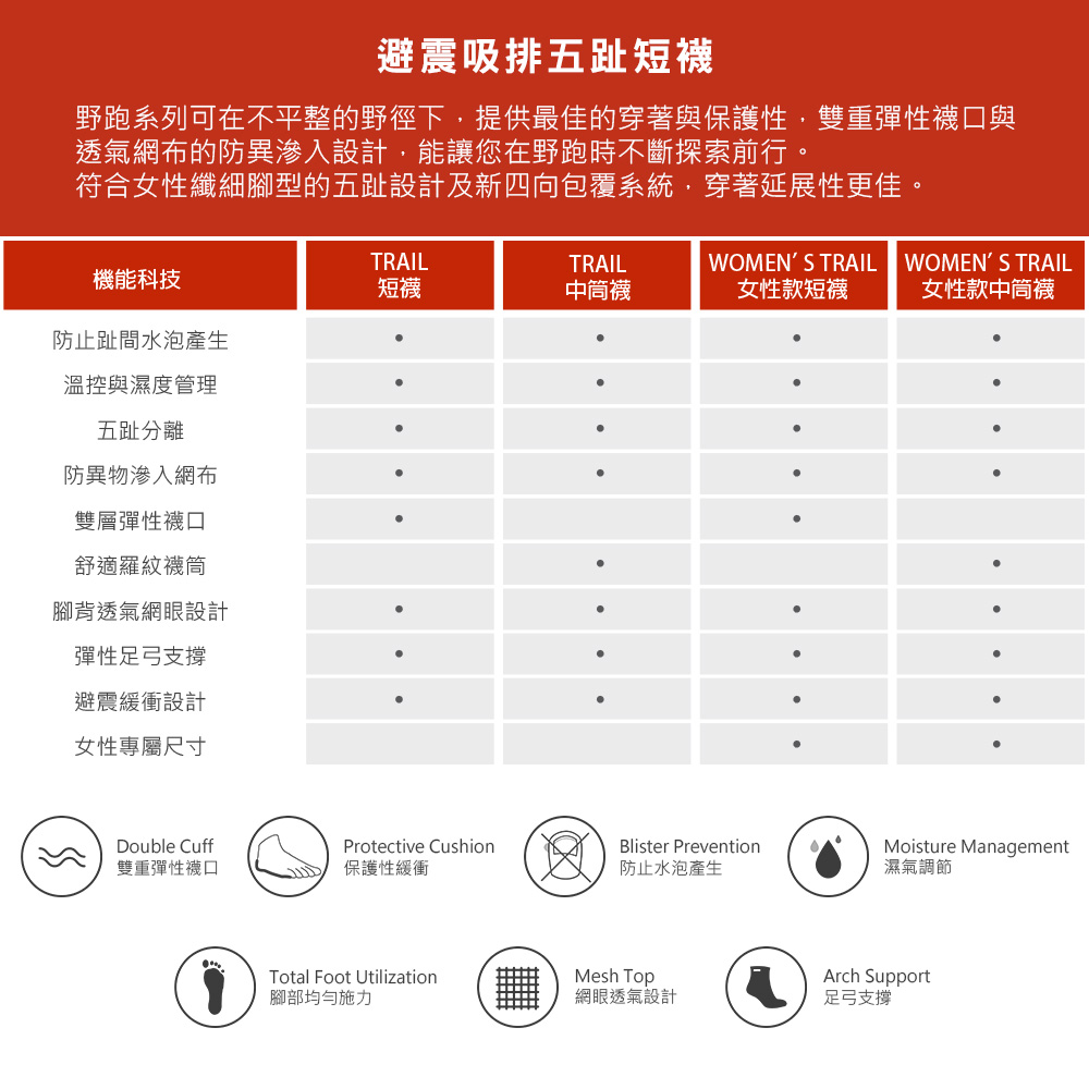 - 五趾分離設計,減少趾縫間的皮膚摩擦,避免水泡產生。