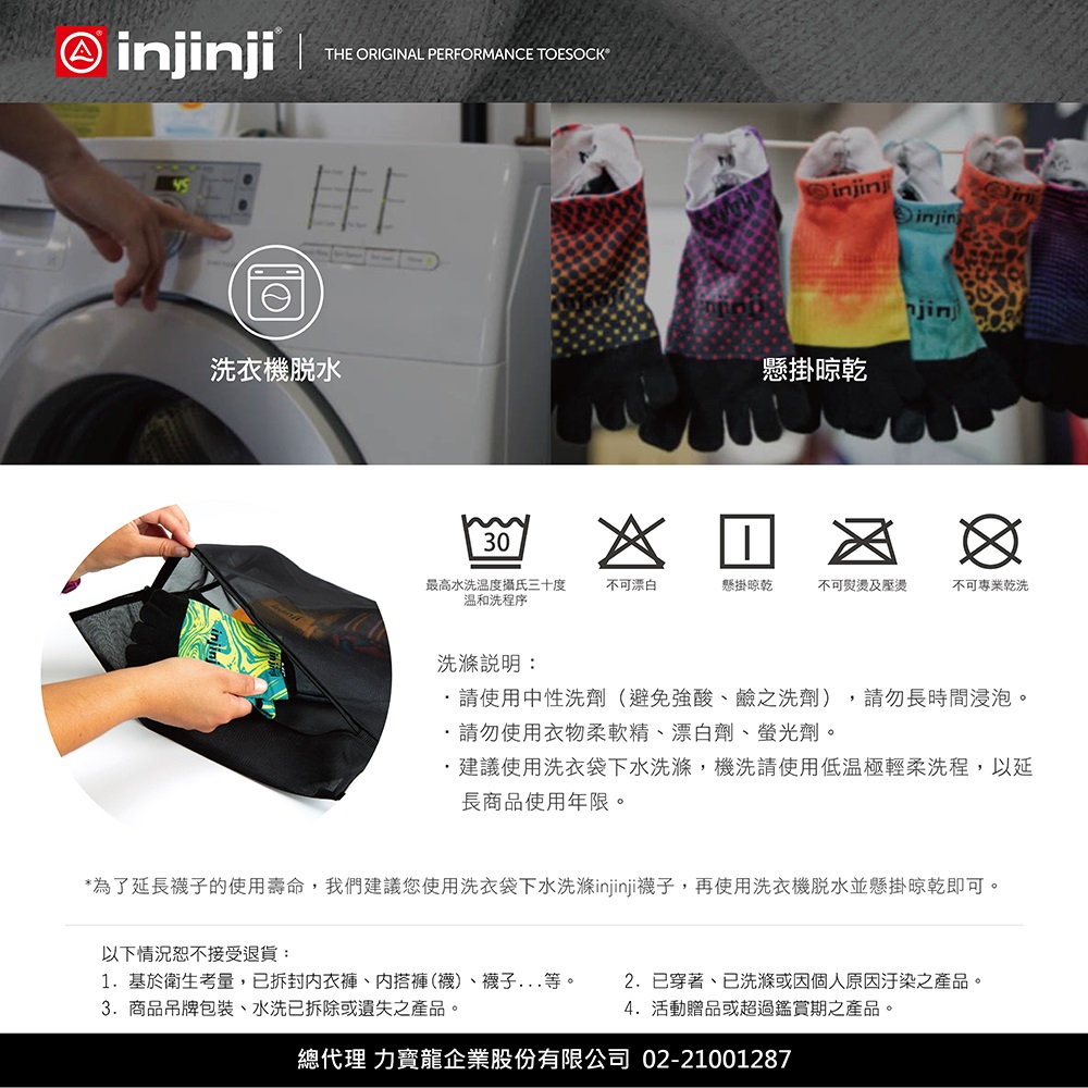 2.深淺色衣物請分開洗滌;請勿使用柔軟精、長時間浸泡、濕放,以防染色。