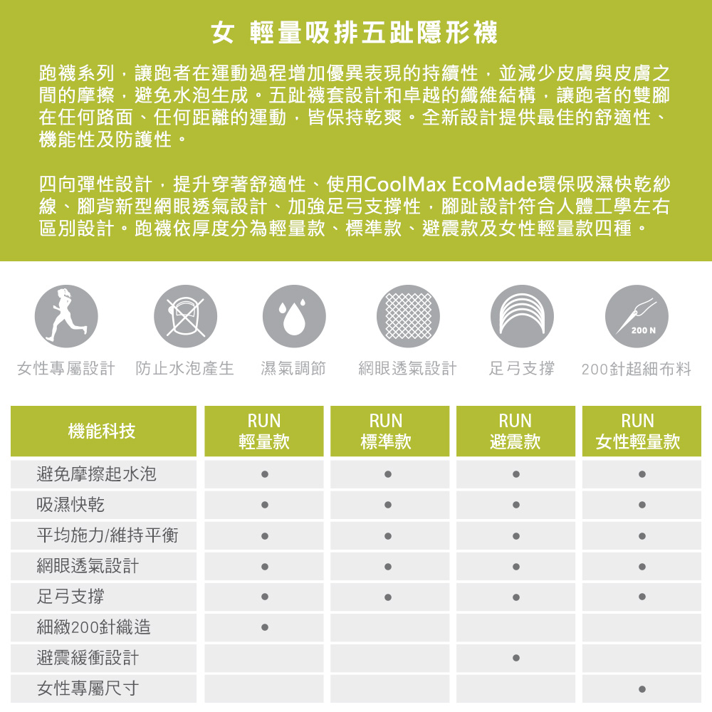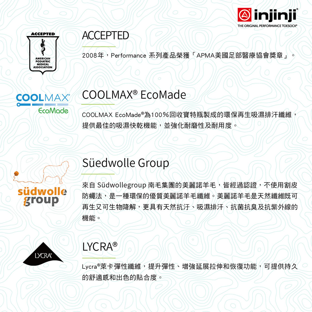 - 採用COOLMAX® EcoMade環保再生纖維,提供最佳的吸濕排汗機能,並強化耐磨性及耐用度。
