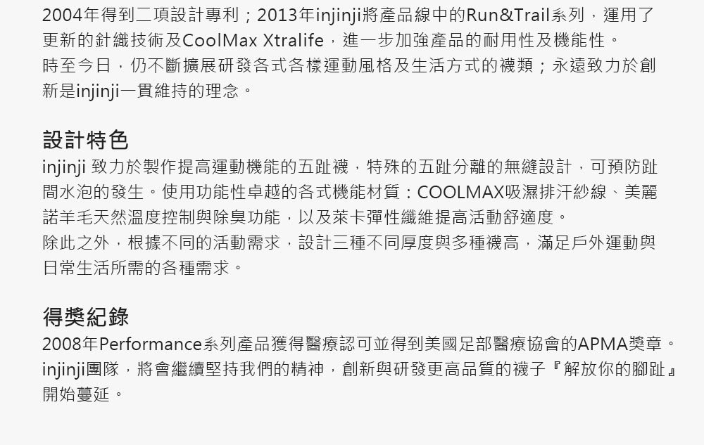 - 五趾分離設計,減少趾縫間的皮膚摩擦,避免水泡產生。